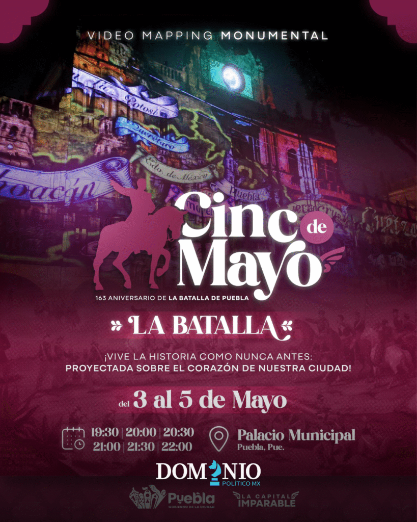 Del 03 al 05 de mayo, el Gobierno de la Ciudad, encabezado por el presidente municipal Pepe Chedraui Budib, proyectará un video mapping monumental en conmemoración a la Batalla de Puebla, una experiencia de luz y sonido que tendrá lugar en la fachada del Palacio Municipal.